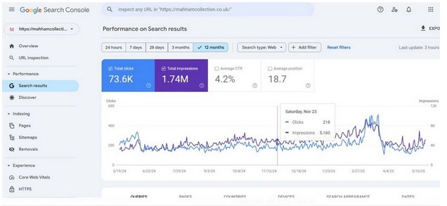 ○ 73.6K clicks and 1.74M impressions in Google Search